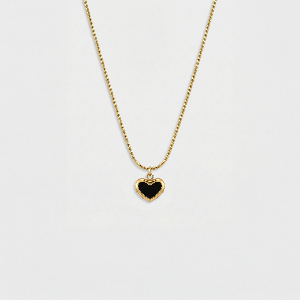 Add a touch of mystery and sophistication to your neckline with our Hancini Midnight Black Heart Necklace. This striking piece features a glossy, heart-shaped black stone (reminiscent of Black Onyx or Enamel) encased in a polished gold bezel. Unlike our beaded chain designs, this pendant is suspended from a liquid-like, silky smooth gold-plated snake chain that glides effortlessly against the skin. This ladies’ pendant necklace offers a stunning high-contrast look that is both modern and classic. Perfect for the woman who appreciates minimalist luxury, this demi-fine jewellery piece is an essential staple that adds a bold yet refined focal point to any outfit.