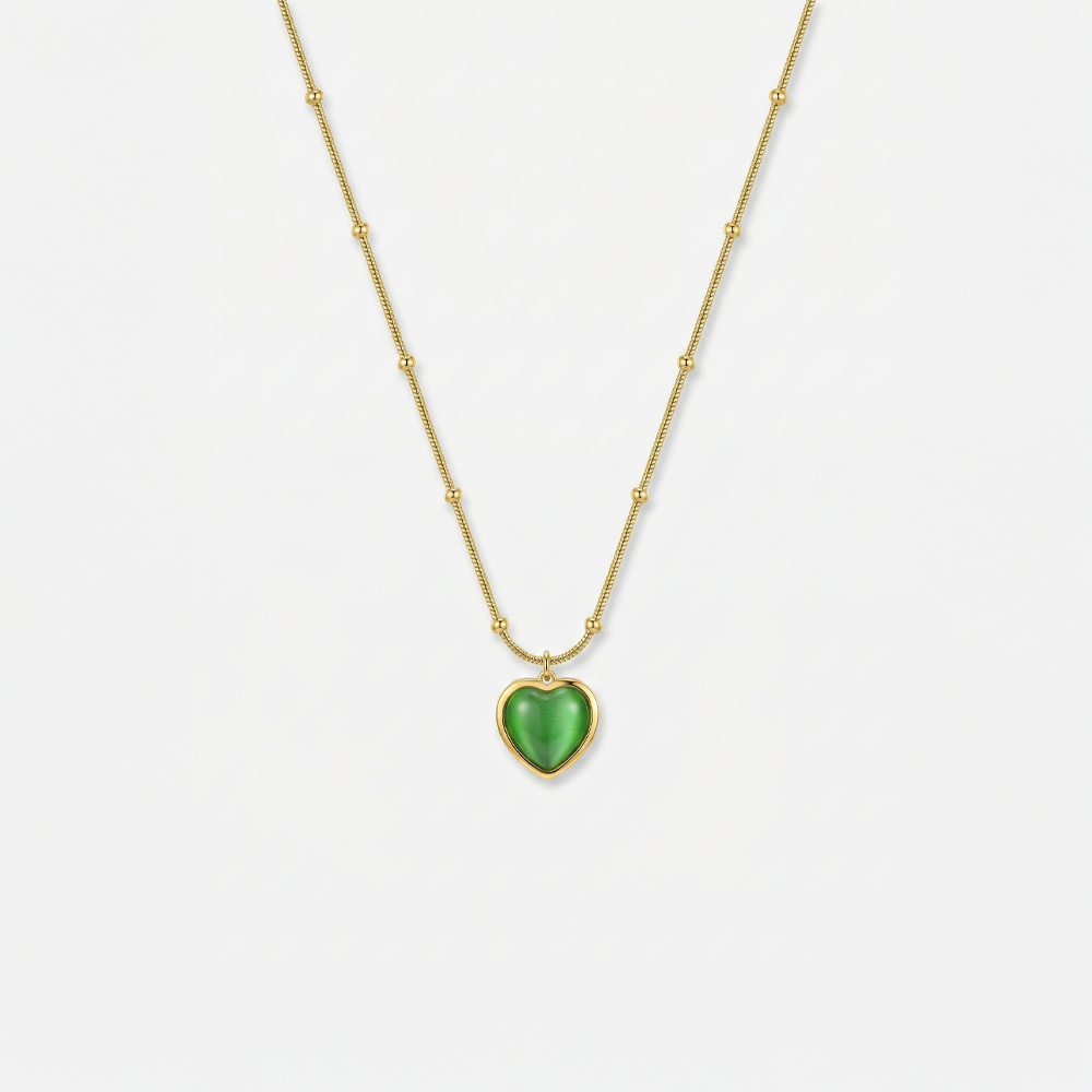 Capture the essence of romance and nature with our Hancini Verdant Green Heart Necklace. This captivating pendant features a smooth, heart-shaped green stone (resembling emerald or green cat’s eye) that gleams with a deep, soothing luster. The pendant is elegantly framed in a gold bezel and suspended from a trendy satellite chain—a delicate gold chain punctuated by small, stationary beads that add delightful texture and shimmer. This ladies’ pendant necklace is a symbol of love and vitality, perfect for the woman who cherishes meaningful, vintage-inspired accessories. Whether you are dressing up for a date night or adding a pop of color to your daily wear, this demi-fine jewellery piece exudes effortless charm.